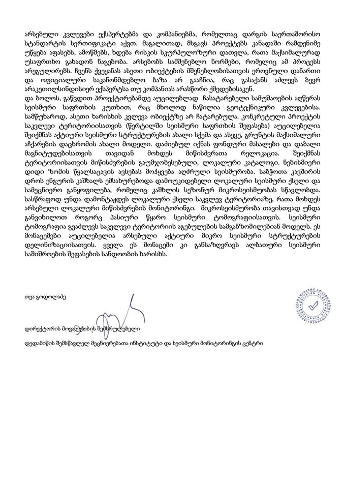 აღნიშნული არაკეთილსინდისიერი ფაქტების აღმოფხვრის მიზნით, დედამიწის შემსწავლელ მეცნიერებათა ინსტიტუტისა და სეისმური მონიტორინგის ეროვნული ცენტრი დამატებით აღარ გასცემს მსგავსი შინაარსის ცნობას.